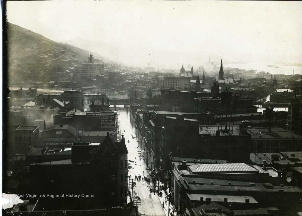 - People are walking down an unidentified street in Wheeling, West Virginia, after a flood, possibly of 1913.