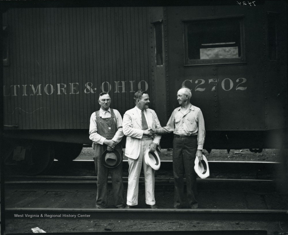 - Three Baltimore and Ohio workers standing in front of a B and O train engine, Grafton, W. Va.