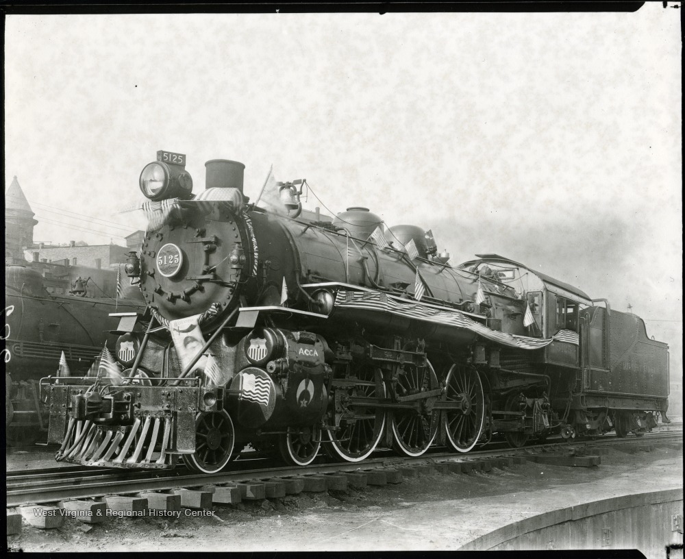 - Engine No. 5125 decorated with American flags in the downtown Grafton, W. Va. yards.