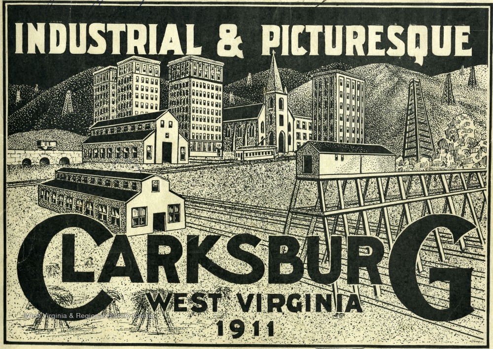 - Image from the cover of 'Industrial and Picturesque Clarksburg, W. Va.' published by the Press of the Clarksburg Telegram Company, Printers and Publishers, Clarksburg, W. Va., 1911. Sketch of Clarksburg buildings. Text from title page and first two pages: 'Industrial and Picturesque, Clarksburg, W. Va. Pictorially Showing Its Numerous and Mammoth Industries Issued by H. R. Fish with the approval of the Board of Trade of Clarksburg, W. Va. Officers: John Koblegard, President; H. E. Travis, Vice President; L. K. Richards, Treasurer; and Charles E. Lamberd, Secretary. Directors: W. Y. Cartwrith, George B. Chorpening, John B. Hart, C. B. Alexander, C. H. Harding, John Koblegard, B. M. Despard, V. L. Highland, Robert Morris, C. V. Erdman, Lynn S. Hornor, L. K. Richards, J. M. Francois, J. M. White, and H. E. Travis. This Pictorial Souvenir Booklet is issued for the purpose of giving those who receive it an idea of the many diversified industries that are located in our city. While it shows the majority of them there are a number of smaller ones employing a great many people which we could not embody in this booklet. We trust the reader will be able to gather from what he sees in this souvenir, a comprehensive idea of one of the most progressive cities in the state. It will be unnecessary for us to go into all the details that would go to make up the advantages that Clarksburg could offer person who are seeking locations for business of any kind, particularly manufacturing. Therefore, we think it wise to confine ourselves to the showing made in this souvenir, and to allow the reader to draw his conclusions as to what we have in Clarksburg by examining the illustrations. Clarksburg is located in the heart of the largest natural gas field in the world. As a result the gas rate to manufacturers is exceedingly low, 4c. per thousand. The gas supply is practically inexhaustible. Clarksburg is surrounded by vast fields of coal which could be furnished at a price about equivalent to natural gas. Vast forests of timber abound within a small radius of Clarksburg, offering exceptional facilities to all manufacturers where wood is its initial product. Fire and pottery clay, and glass sand of fine quality are found within the immediate vicinity. Clarksburg ranks second in the state in wholesale business, and has the largest wholesale grocery house in the state.' Text from the final page: 'Advantages of Clarksburg. She has two up-to-date daily newspapers and two weekly newspapers. She has 32 passenger trains, and hourly traction trains arriving and departing daily. She has the cheapest fuel and power on earth - natural gas in an inexhaustible supply. She has excellent banking facilities, sound and reliable. She is the best city in West Virginia in proportion to population. Her jobbing houses have an enviable reputation. She has a community of high class merchants and manufacturers. Come and see us and we will convince you of these facts. The Modern Engraving Company, of 124 East 8th St., Cincinnati, O., Made the majority of engravings in this souvenir.'