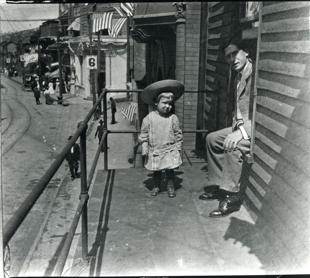 - Man with a small child on a balcony overlooking Main Street in Grafton, W. Va.