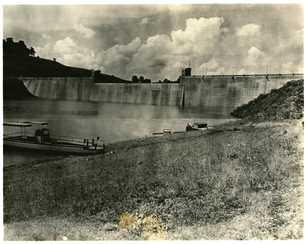 - The backside of the Tygart River Dam near Grafton in Taylor County. A boat rests on the shore in the foreground.