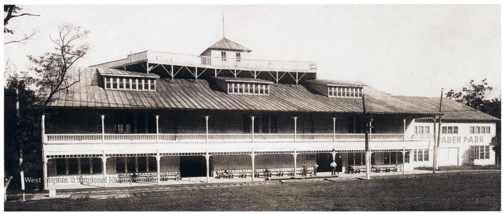 - 'The building on the right housed a merry-go-round. No longer standing. Site of Gorby Reunions in the 1930's. Note streetcar tracks in front of pavilion. The trolley connected New Martinsville, Paden City, Sistersville and Middlebourne before the highways connected the towns. W. Va. Rte. 2 replaced the trolley tracks in the foreground.'