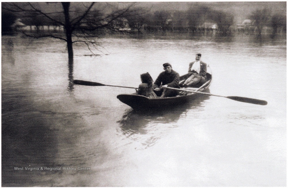 - 'Late 1940's flood picture taken from the porch of the Gorby home at 663 Maple Avenue, New Martinsville, W. Va. Maple Avenue is 6-8 feet beneath the boat. My sister Martha; Sam McColloch has the oars; and Aunt Mary Louise Gorby in the far end. The rowboat belonged to the Gorby Bros. store. It had many uses during the floods from delivering groceries, moving the store stock and furnishings, and taking us to the church to help move the church furniture. When the work was finished, there was time to row around town and explore where everything familiar was submerged. Then later, the cleanup would begin. It was a big adventure for the children but not for the adults.'