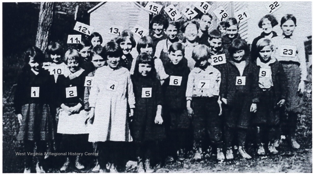 - '1. Unknown, 2. Ellen Belle Berger, 3. Oscar Schupbach, 4. Harriett Mullett, 5. Ruth Mullett, 6. James Schupbach, 7. Forrest Howell, 8. George Mullett, 9. Howard Howell, 10. Carrie Potts, 11. Virgil Walker, 12. Freda Walker, 13. Elizabeth Postlethwait, 14. Hazel Potts, 15. Mary Louise Mullett, 16. Sheldon Pyles, 17. John Potts, 18. Lloyd Walker, 19. Stella Potts, 20. Joe Berger, 21. Glen Schupbach, 22. Teacher - Miss Georgia Litman, 23. Glen Mullett.'