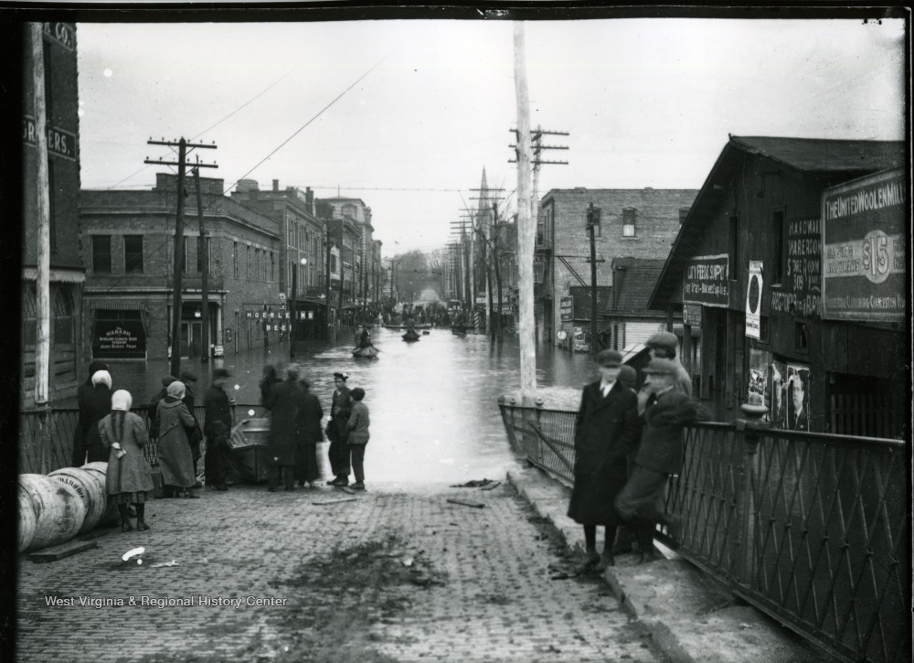 - Townspeople are pushing their boats down an unidentified street in Parkersburg, West Virginia during the flood of 1913.