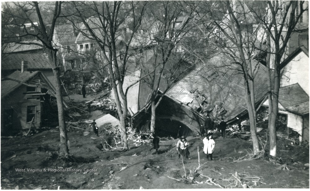 - 'Looking down toward Avery St., Parkersburg, W. Va.' People walk amongst the wreckage of houses after the water tank disaster.