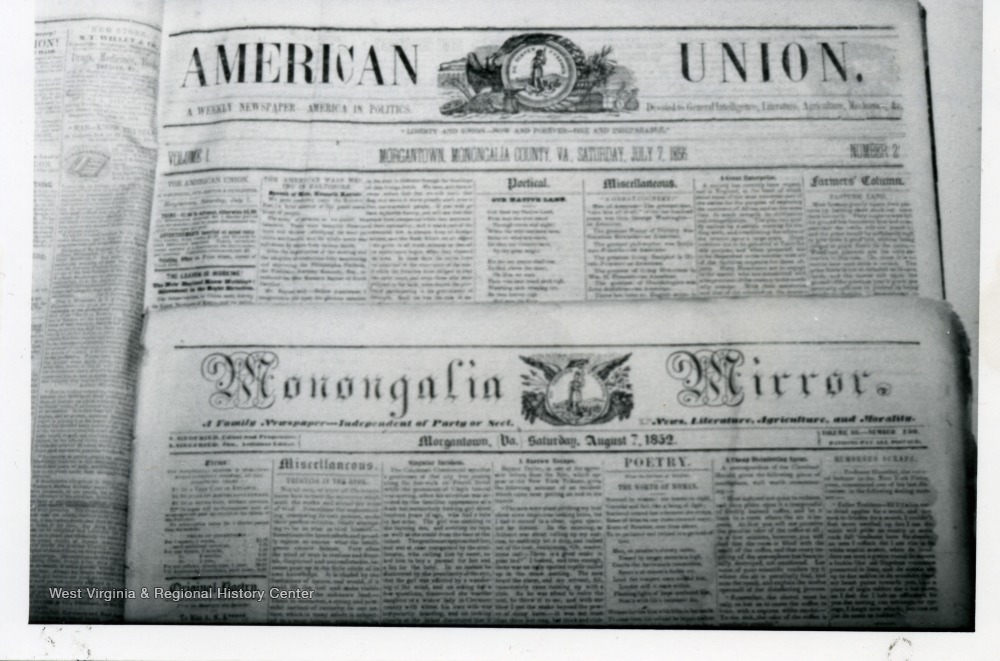 - 'American Union and Monongalia Mirror are two early Morgantown newspapers published by the Siegfried family exhibited strong Temperance or Know-Nothing biases.'