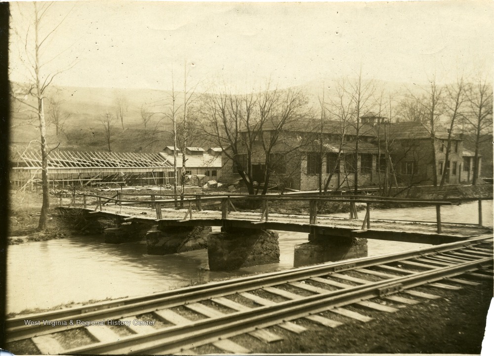 - 'Shirt Factory Marilla next to Recreation Center.' Train tracks run parrallel to shirt factory. Bridge leads to the shirt factory from the train tracks.