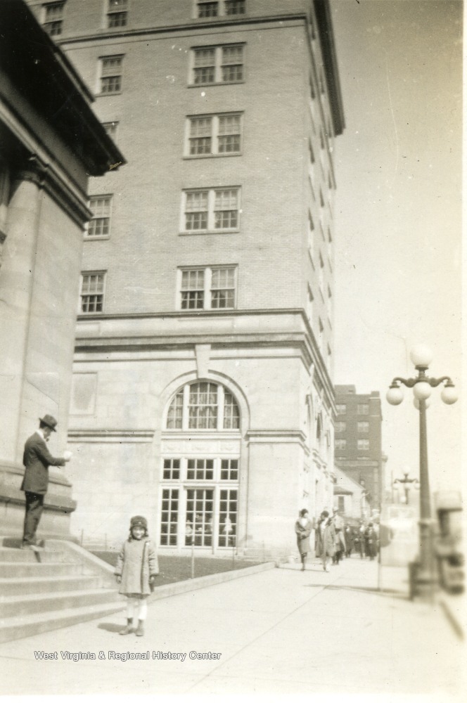 - Young girl standing in front of the Post Office and near Hotel Morgan, in Morgantown, W. Va.