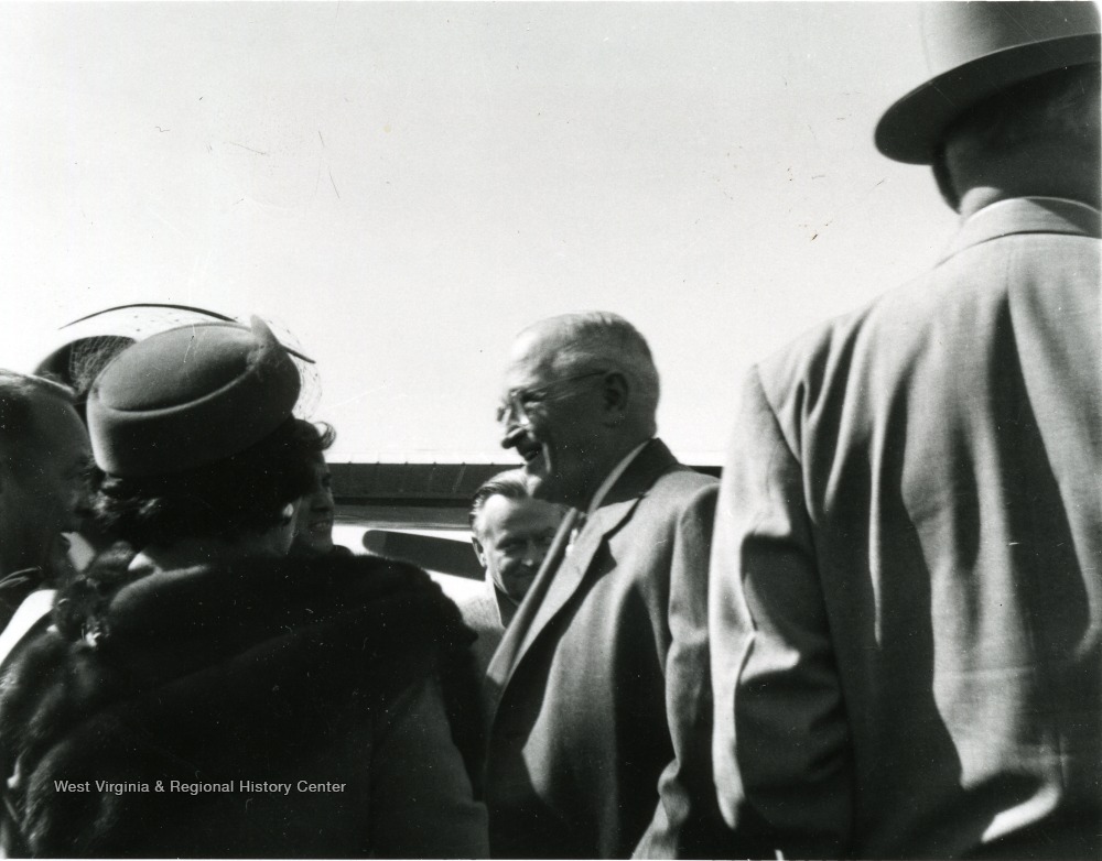 - 'Truman arrivial at Morgantown Airport. Bill Hart, Dominion New Editor, at his immediate right facing camera. Lady facing Truman is Violet Snedegar, committee woman from Elkins. Sheriff Johnson back to camera.'