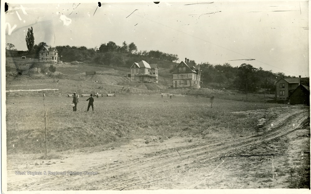- Two unidentified men stand in the middle of the athletic field near Fraternity Row on North High Street in Morgantown, West Virginia. This photograph was taken when the first houses were being built along Fraternity Row.