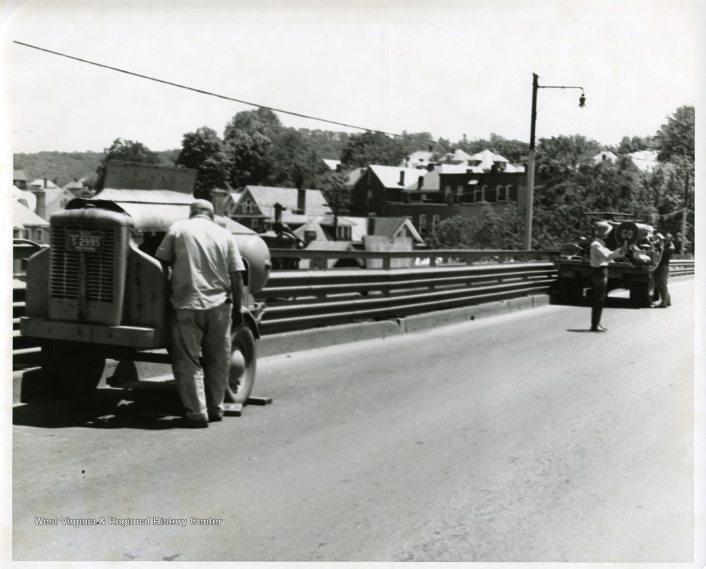 - Road crew members are repairing High Street Bridge in Morgantown, West Virginia.