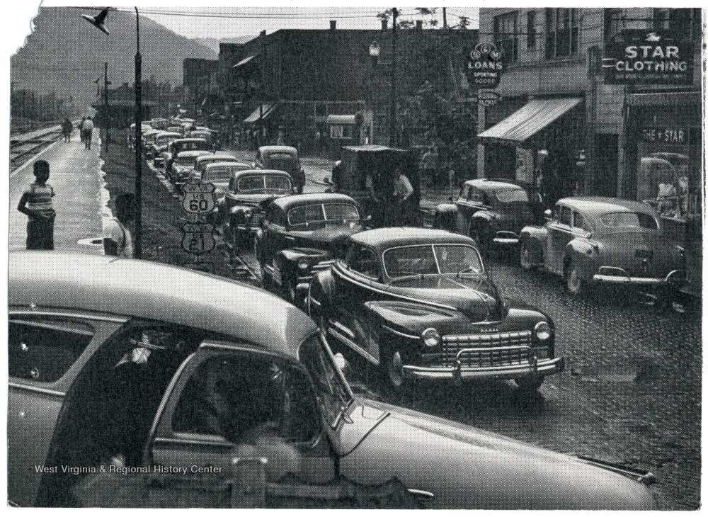 - Traffic and Parked Cars on Route 60 in Montgomery, Fayette County, W. Va.