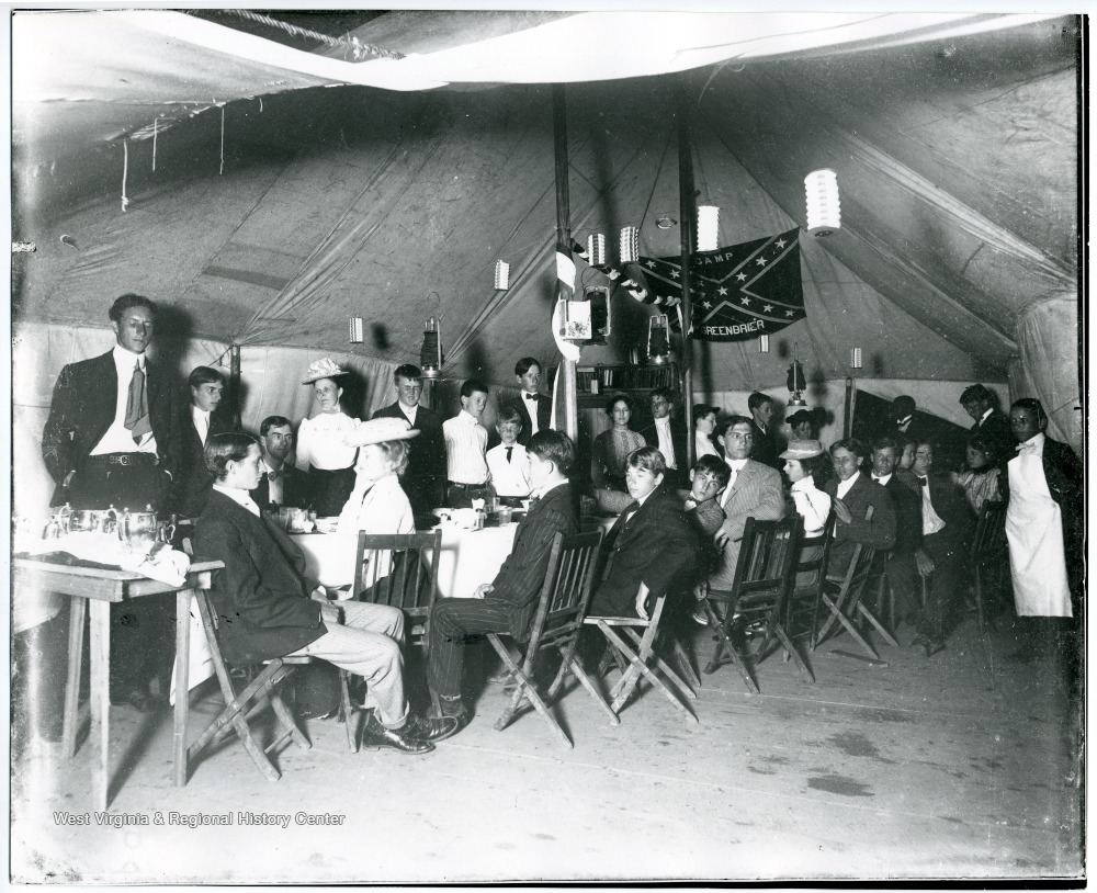 - People gathered for a party under a Confederate flag bearing the inscription "Camp Greenbrier" with two African-Americans dressed as servers standing in the background.