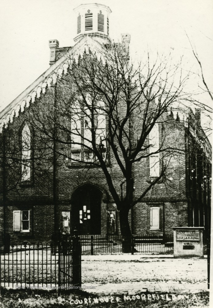 - View of the old Court House on Main Street in Moorefield, opposite the Presbyterian Church. 'The old brick Court House on Main Street was the second Court House. This fine old building sat back about thirty feet from the side walk with an iron fence in front. This was done by the Eberlys. This building was used until 1913 when the new Court House on Washington Street was opened. It was a nice cool old building. The large trees in the yard provided nice shade for loafers on hot summer days and the well of cold fresh water is just hidden by the scales along the street. There was always several benches in the yard in the summer time. Just inside of the front door wide steps led to the main court room on the second floor. The court room had a gallery around the North, East, and South sides with Judges stand and Jury seats in the West. The gallery was held up by large iron posts. At this time (1955) some of these old iron posts are serving as porch posts at the home of Howard Williams West of town. On the first floor a passage way led around both sides of the steps and into a hall in the center of which led to the back of the building. On both sides of this hall were offices for the Sheriff, Clerk, and lawyers. Picture is from Miss Maie Alexanders Moorefields Oldest Htg. and Appl. dealer collection.'