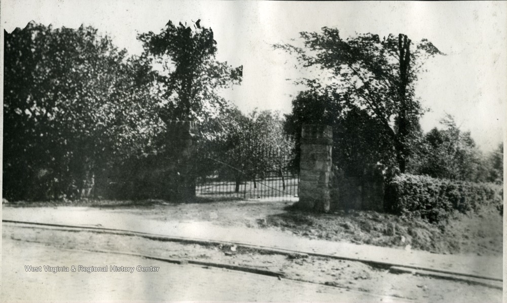 - 'This is the Point Breeze Gate. Down to the right (this side the hedge) runs the road to Wheeling, through the farm and past the barns. The tracks of the street car line from Wellsburg to Bethany are seen in the foreground. This side the tracks is the virtified brick road, a state highway between the two places.'