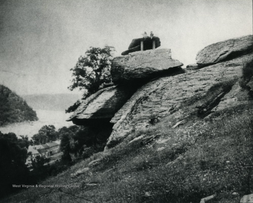 - 'The famous rock at Harper's Ferry which was so often visited by President Thomas Jefferson, was named after him. It was from this point that Jefferson made his well-known remark that a view from this rock was 'worthy of a trip across the Atlantic'. It commands a view up and down the Shenandoah and across country for a distance of forty miles.' From West Virginia Collection Pamphlet 7514 'Picturesque Scenery among the Allegheny Mountains of NY, PA, MD, VA, and WV, etc.' Neely Educational Library, No. 6, 1899, F. Tennyson Neely, Publisher.