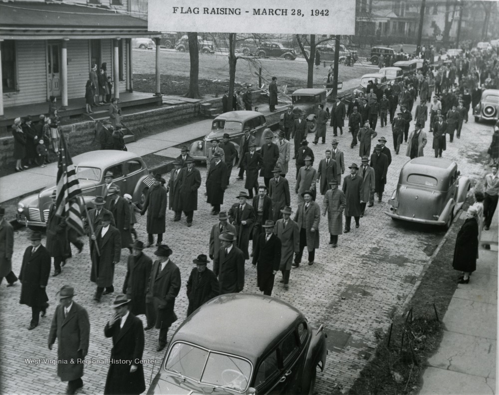 - A scene from the flag raising parade for the Fostoria Glass Company.