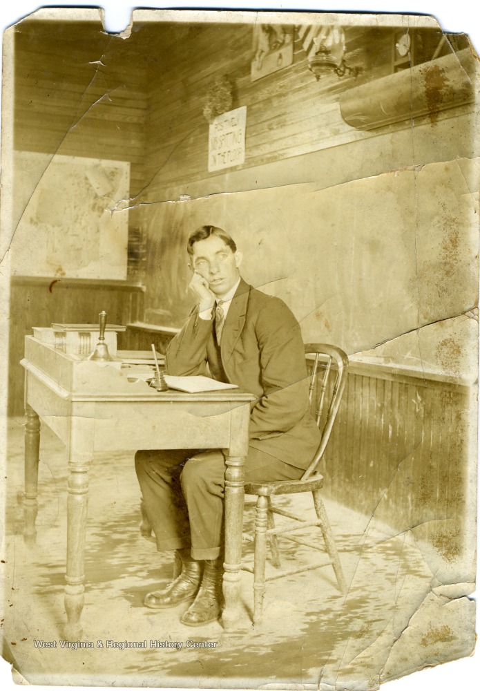 - Clifford Coombs sitting at his desk teaching at Union School, near Lowesville, West Virginia. Lowesville is now present day Rivesville, West Virginia.