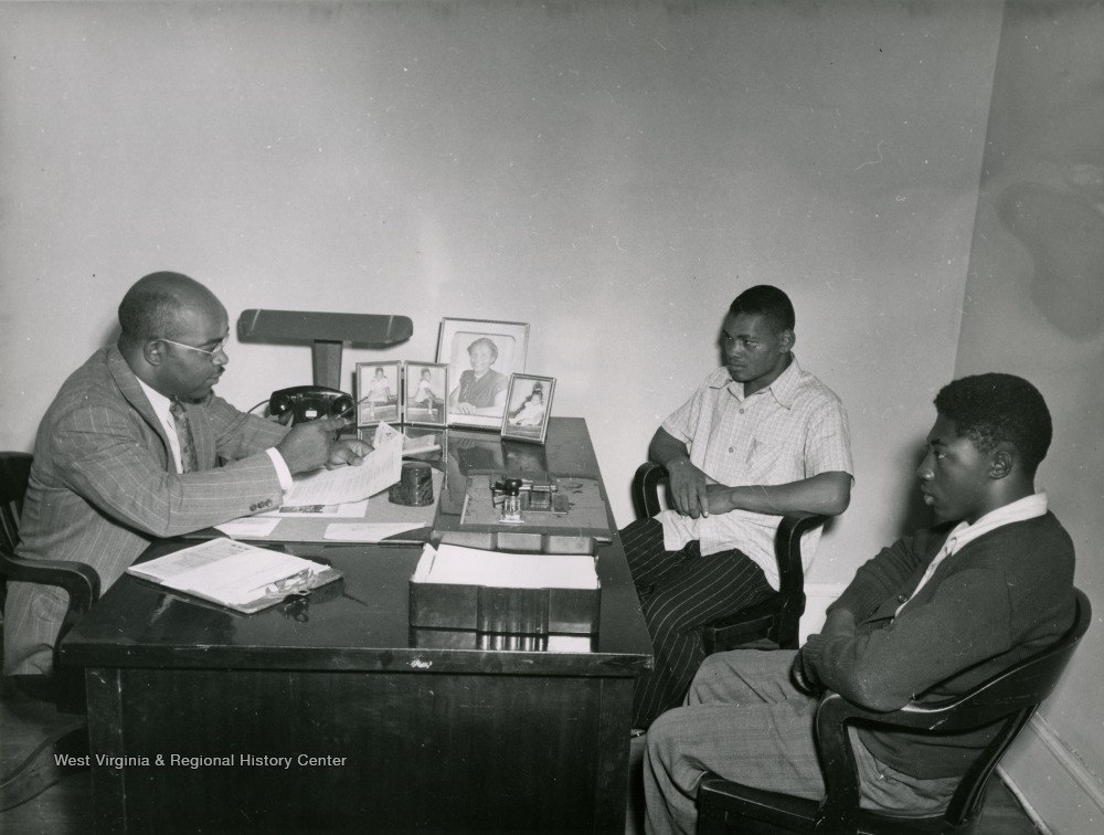 - Two young African American men sit in an administrative office at the West Virginia Industrial School for Colored Boys in Lakin.
