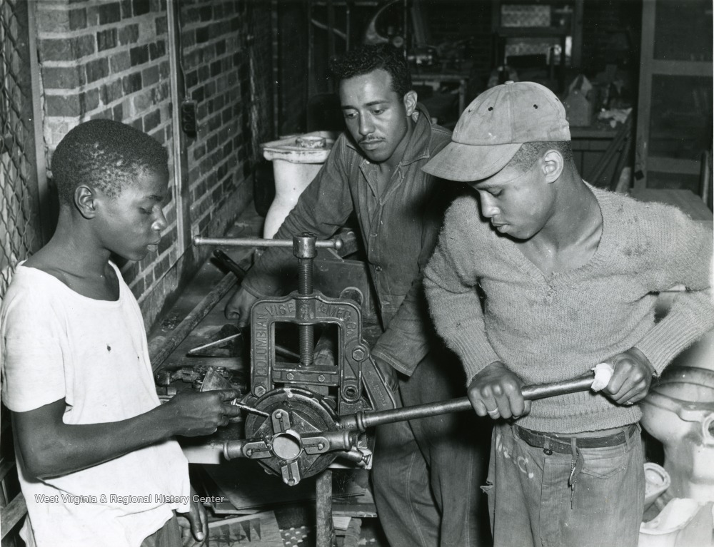 - A scene of three African American boys putting some equipment into a vice at the West Virginia Industrial School for Colored Boys.