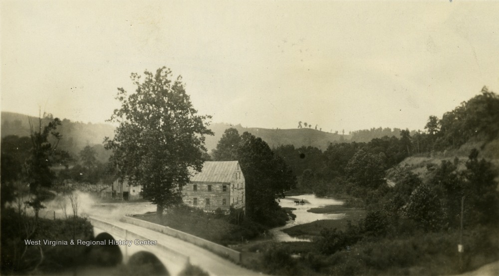 - A distant view of Jackson's Mill and the road leading to it.