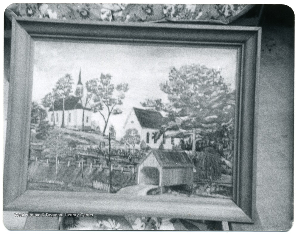 Photo of a Painting of a Covered Bridge and Baptist Church in Wadestown, Monongalia County, W. Va.