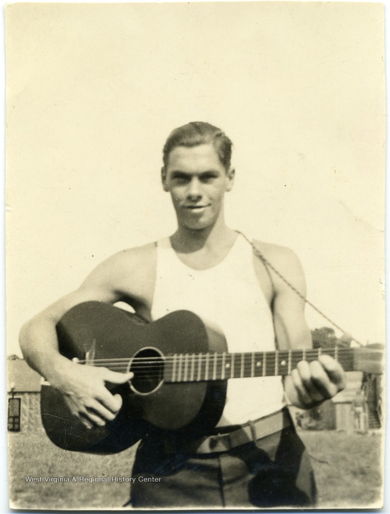 Clyde Paul Evans with Guitar at Civilian Conservation Corps Camp Crawford, Elizabeth, Wirt County, W. Va.
