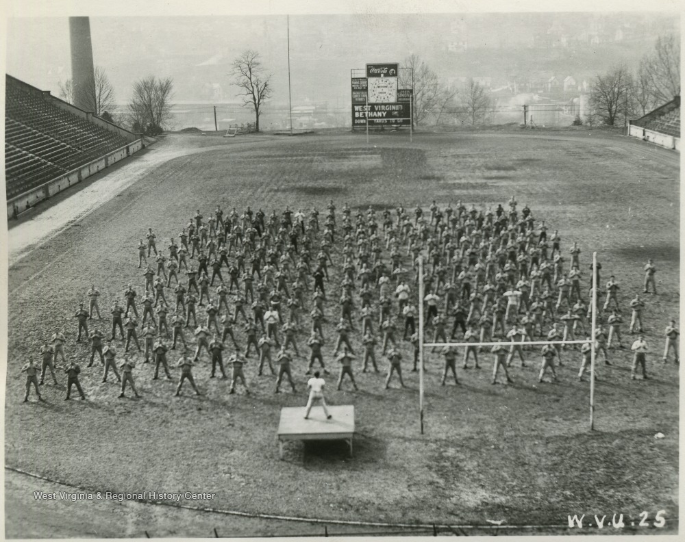 - Stadiums--West Virginia--Morgantown., Calisthenics--West Virginia--Morgantown., Physical education and training, Military., WVU--Buildings--Mountaineer Field.