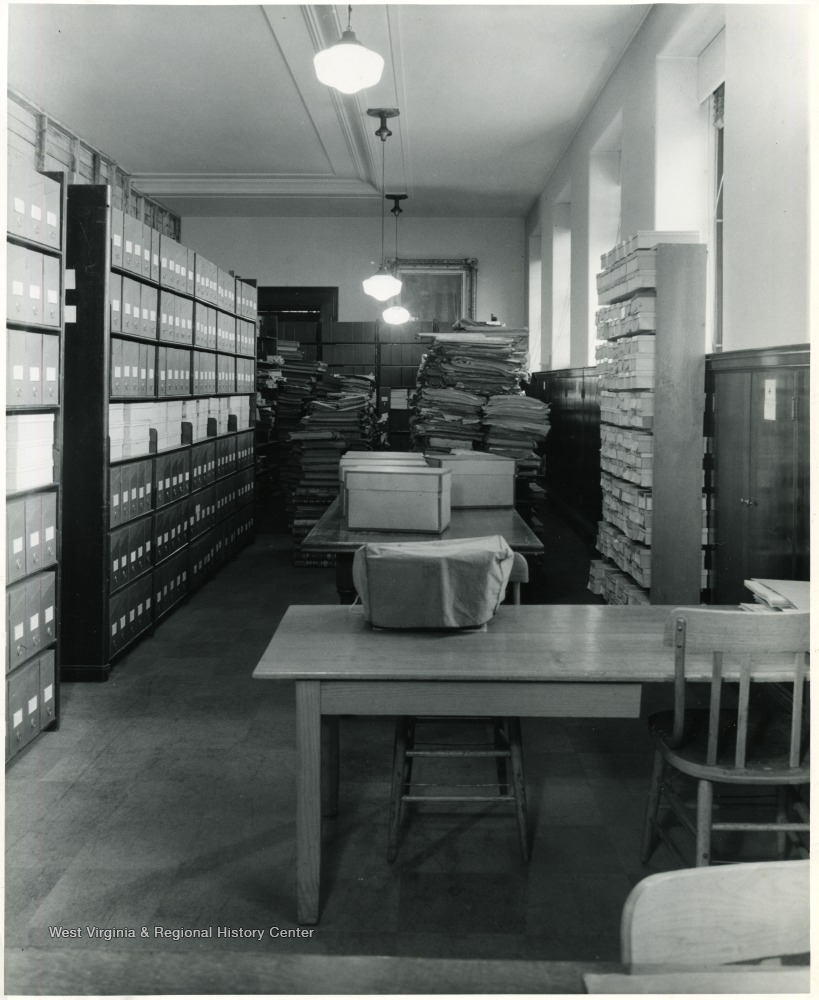 - Books and paper in background. Boxes on the shelves on the left. Table and chairs in the foreground.