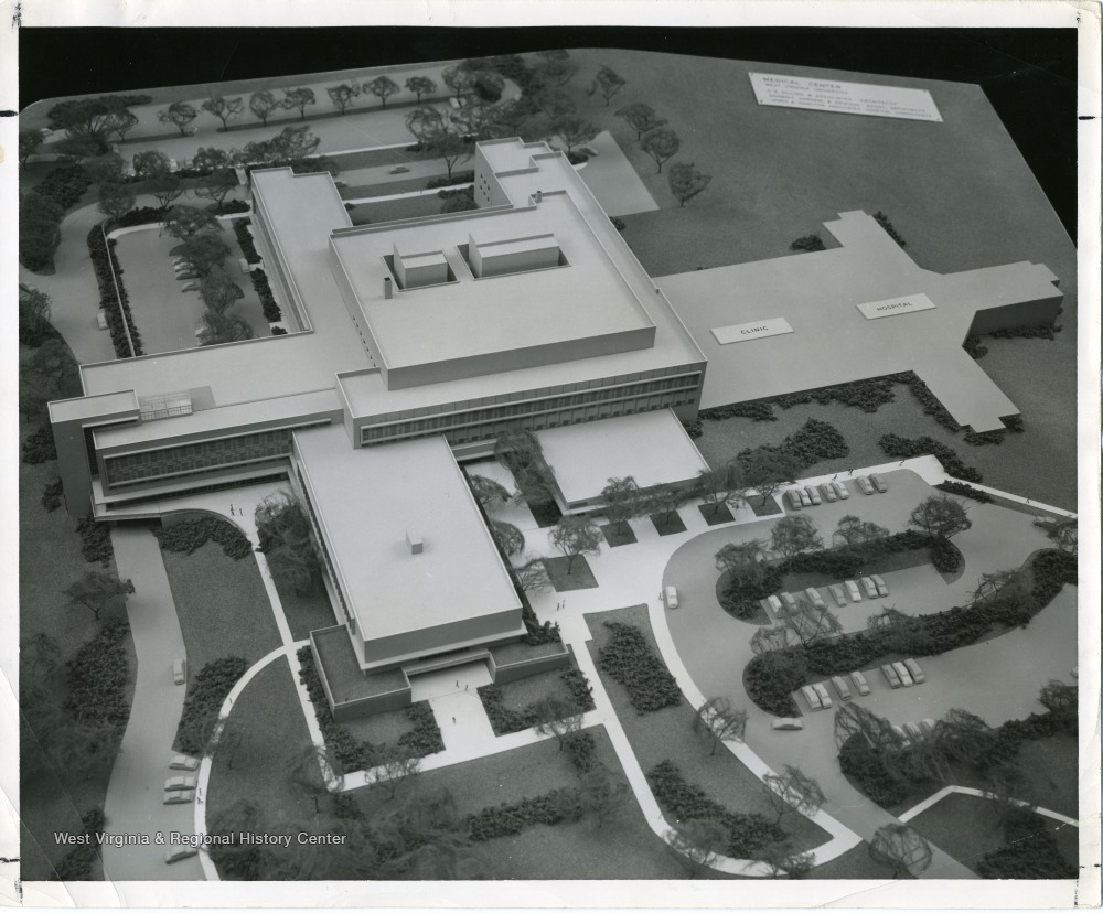 - 'An architect's scale of the proposed Basic Sciences Building in West Virginia University's new Medical Center. Also shown is the location, to the right, of the proposed teaching hospital, which will be planned initially to contain 400 beds. The Basic Sciences Building, for which ground is to be broken soon, will be five stories in height and contain more than 1,000 rooms. Its functions will be to house facilities for instruction in the pre-clinical years in medicine, nursing and supporting fields, as well as the full program in dentistry and pharmacy. Architects for the Center are C.E. Silling and Associates, Charleston. West Virginia University Bureau of Information--for use September 5, 1954 and thereafter.'
