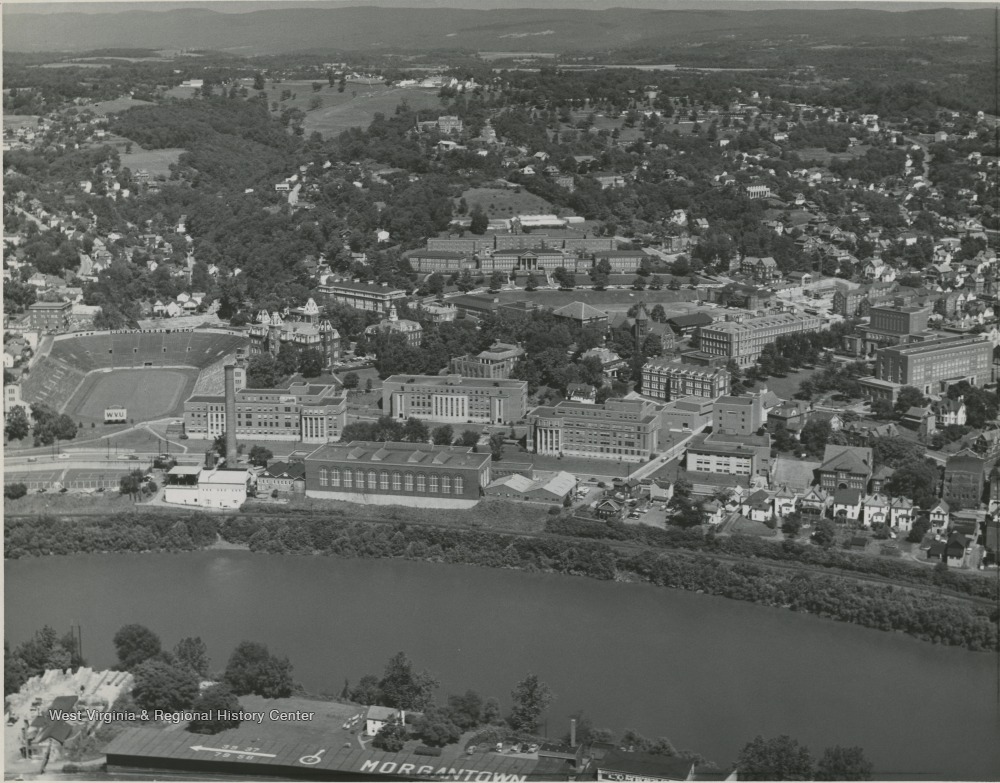 - College campuses--West Virginia--Morgantown., College buildings--West Virginia--Morgantown., WVU--Campus Scenes and Views--Aerial.