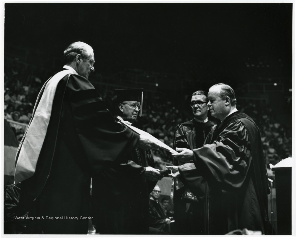 - Left to right: 'First man unidentified, Dr. Frasure, Dr. Munn, President Harlow'.