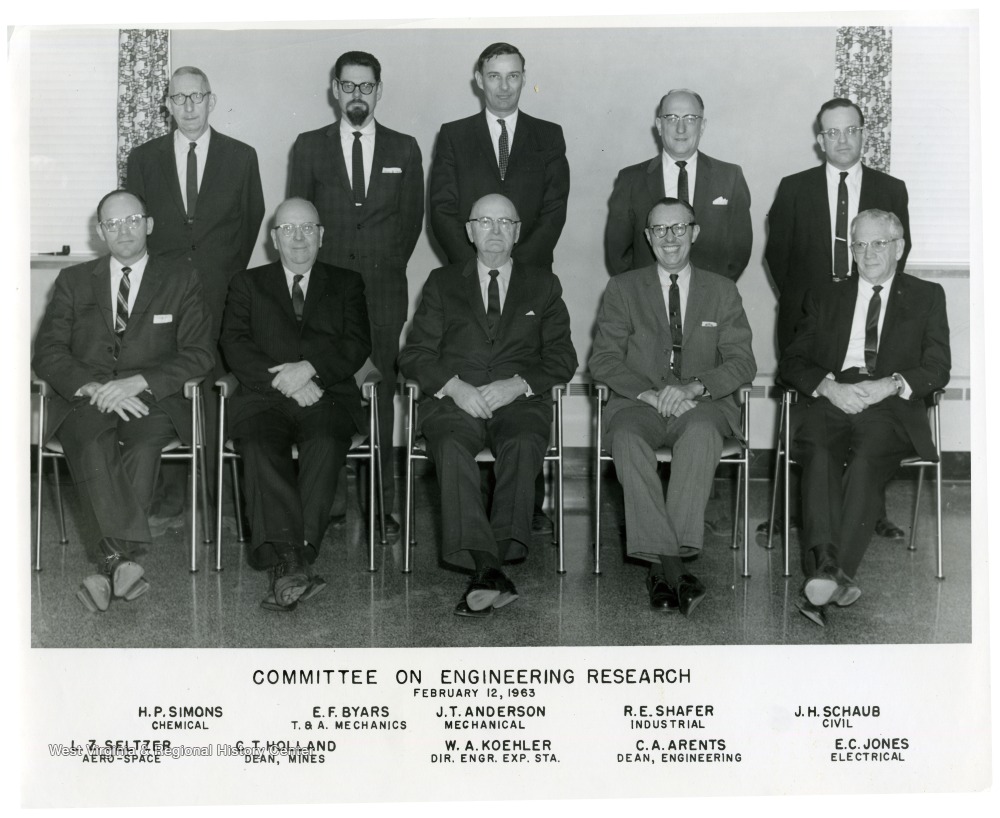 - 'Standing, Left to Right: H.P. Simons (Chemical), E.F. Byars (T. & A. Mechanics), J.T. Anderson (Mechanical), R.E. Shafer (Industrial), J.H. Schaub (Civil); Seated, L.Z. Seltzer (Aero-Space), C.T. Holland (Dean, Mines), W.A. Koehler (Director, Engineering Experimental Station), C.A. Arents (Dean, Engineering), E.C. Jones (Electrical).'