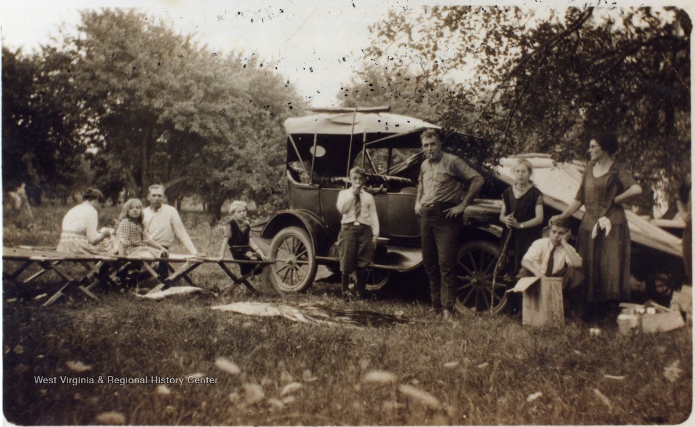 - Charles Green family camping in an apple orchard, one day's journey north of Marietta, Ohio. They are standing around Charles Green's 1918 Ford car. From left to right: Daisy Newhart, Helen Newhart, Lawrence Newhart, Violet Green, Richard Newhart, Charles Green, Lily Green, Benton Green, and Rosa Green.