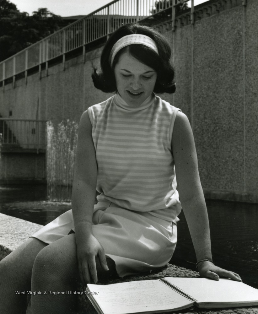 - Female Student Looking over Notes by the Mountainlair Fountain, West Virginia University