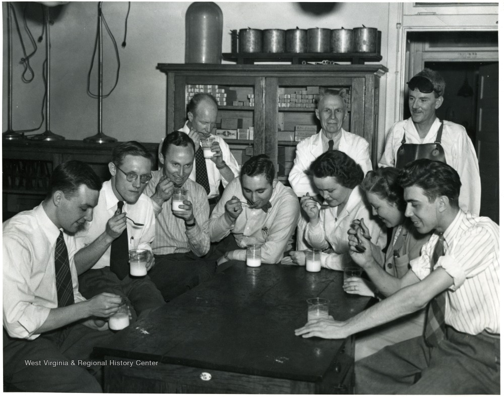 - Students participating in Gastric Emptying Studies each sampling milky liquid in a beaker while faculties in a lab coat looking over them. Photo includes 'Martha Coyne.'