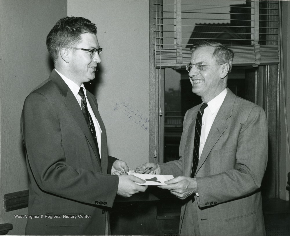 - President Irvin Stewart on right exchanges a bill and an envelope with other person.