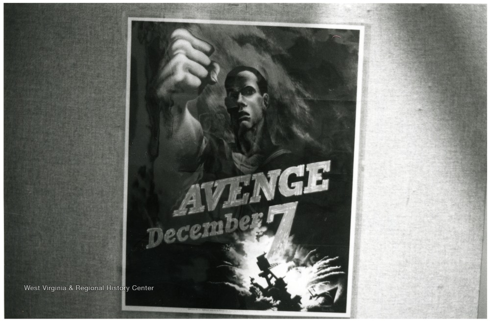 - Exhibit in second floor gallery of Mountainlair. Poster says, 'Avenge December 7'.