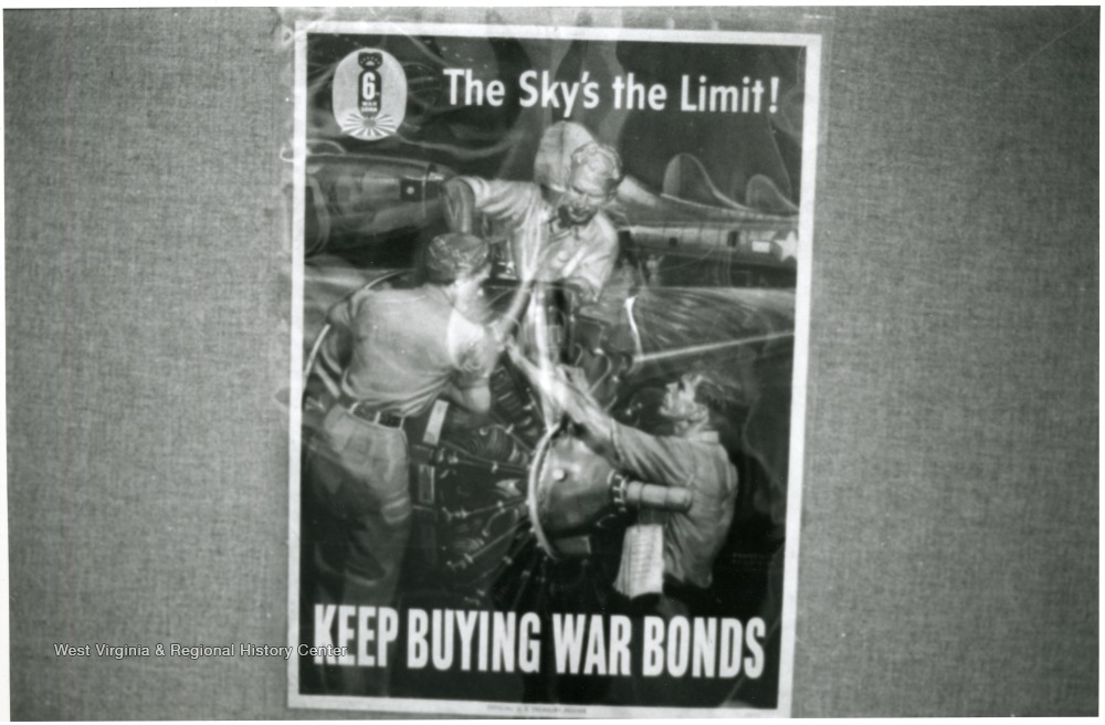 - Exhibit in second floor gallery of Mountainlair. Poster says, 'The sky's the limit, keep buying war bonds'.