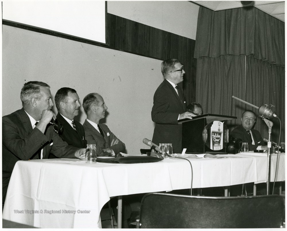 - 'Peter Muirhead, associate U.S. commissioner of education, is shown speaking at the Sept. 12, 1967 seminar on "The State University." Also shown, from left to right, are: Keith Glancey, WVU prof. of education; Thomas Isaack, WVU prof. of management; Thomas Canning, WVU prof. of music; Ruel Foster, WVU prof. and chairman of English and chairman of the seminar planning committee; and James G. Harlow, president of WVU.'