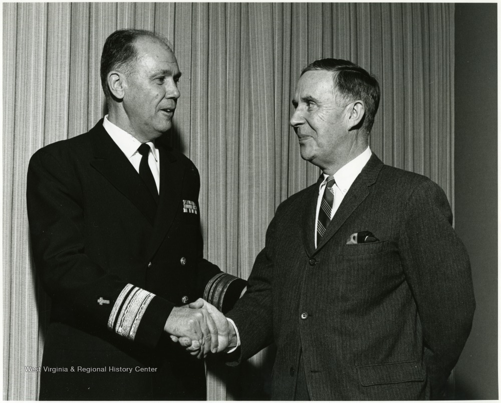 - 'Read Adm. James W. Kelly, chief of Naval Chaplains (left), shakes hands with Rev. Joe Gluck, WVU director of Student Affairs at "Man and His Religions" Symposium Jan. 7-9, 1968.'
