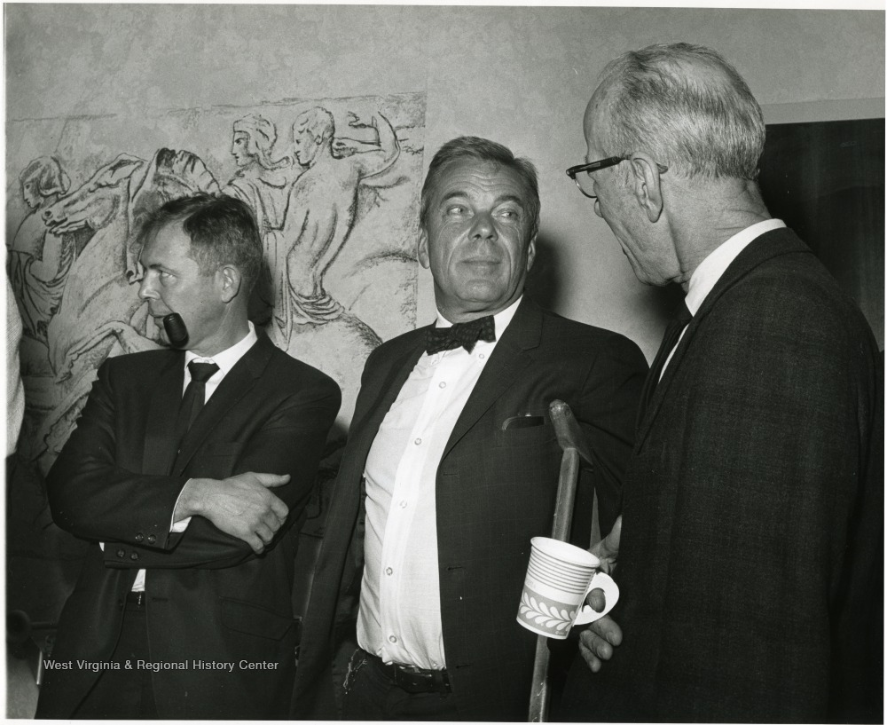 - Dr. T. H. Hunter, chancellor for medical affairs at the University of Virginia (center), is shown at the Nov. 28, 1967 seminar on the Future of Undergraduate Education at WVU, chatting with two WVU professors, Edward Steele, Jr., Prof. of History (left), and Earl Boggs, Prof. of Education, Director of Admissions, and Assistant to the President (right).'