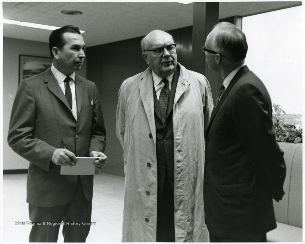 - 'Famed international figure Paul-Henri Spaak (center) speaks with WVU Editor John Luchok (left) and 100th Ann. Exec. Director Donovan H. Bond (right) before Spaak's Nov. 2, 1967 address.'