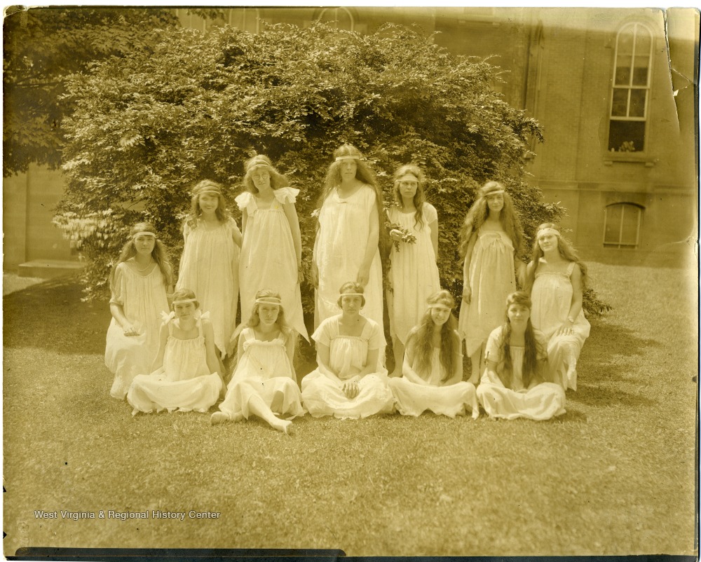 - Female students of aesthetic dancing group pose in Woodburn Circle. Back row from right: Miss Lester; Gracia Remsburg; Emma Myers; Mary Curran; Oney Dent; Elsie Happel; Mildren Eastwood. Front row from right: Beulah Carson; Rachel Remsburg; Miss Rymer; Mrs. Waston and Bebby.