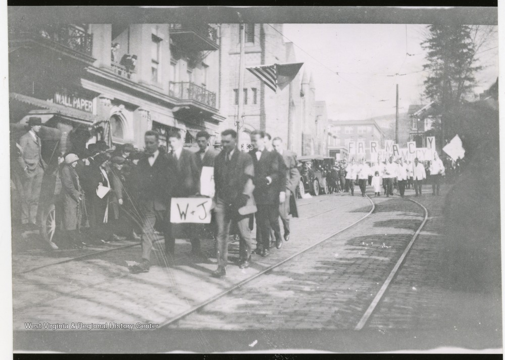 - A thanksgiving day parade: students are holding a sign of 'W&J' while they march the street.