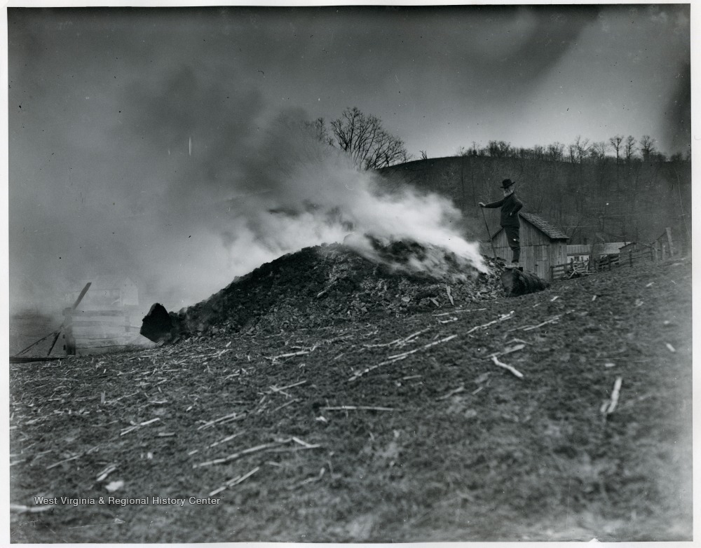 - A man watches over a pile of burning material.