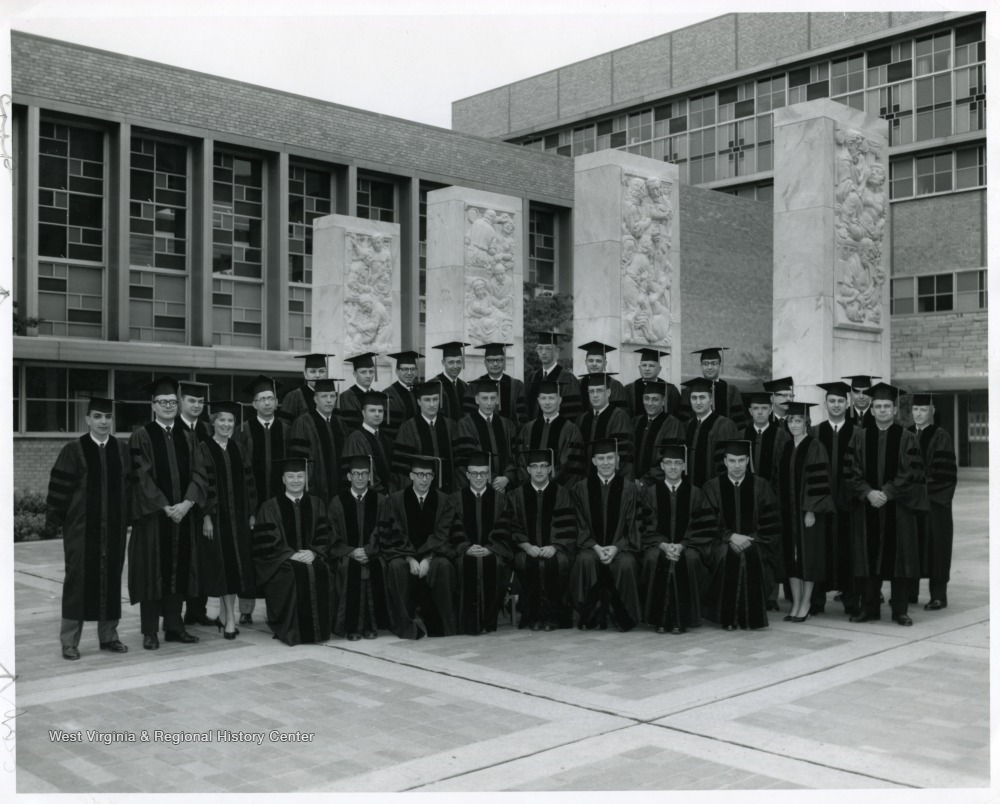 - Graduating Students in Cap and Gown in front of Medical Center Pylons, West Virginia University