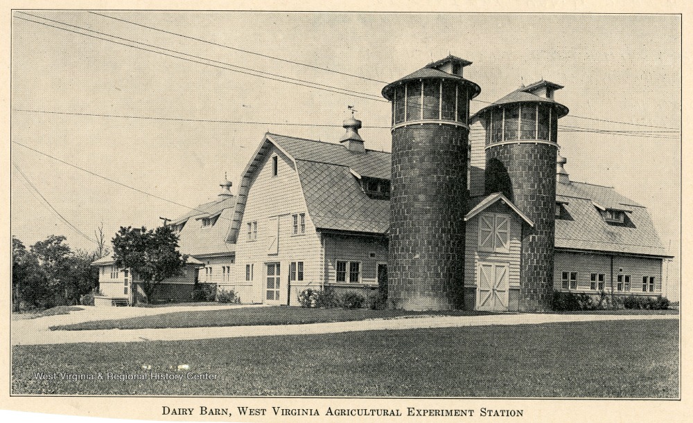 - A view of dairy barn and silos of West Virginia Agricultural Experiment Station.